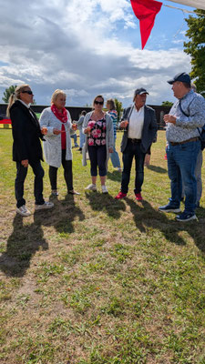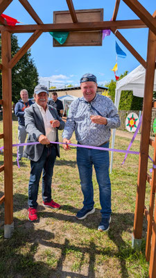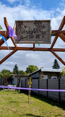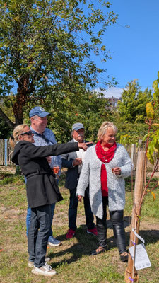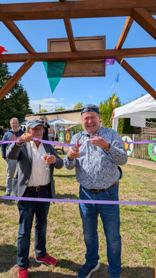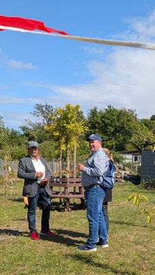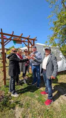 ... Die Eröffnung der Veranstaltung war in diesem Jahr eine etwas Andere. Durften wir doch den Vorsitzenden des Stadtverbandes der Leipziger Kleingärtner, Robby Müller als Gast begrüßen. Und das hatte auch seinen Grund. Nach monatelanger Buddel-, Mäh-, Stemm-, Pflanz- und Mulchverteilarbeit wurden pünktlich um 14:00Uhr zwei Scheren an ihre Funktionäre übergeben. Die Eine in der Hand von Wolfgang Weigelt, dem aktuellen zweiten Vorsitzenden im Verein, die Andere in der Hand von Robby Müller. Gemeinsam stand man um 14:00Uhr vor dem Band, was der Eröffnung unseres Naschgartens vorangehangen war. Schnipp Schnapp und Herzlich Willkommen lieber Robby in unserem Naschgarten. Warum der Herr Müller sich das Ganze mit anschauen und vor Allem der Eröffnung persönlich beiwohnen wollte? Ganz einfach: Nur durch die Hife des Stadtverbandes war es dem Orgateam rund um Anja Schlegel und Uta Weigelt möglich, eine brache und traurige Fläche im Verein umzuwandeln in einen Begegnungsgarten, der seine Besucher einlädt, Feige, Nektarine, Birne und Heidelbeere zu naschen und einfach mal ein paar Minuten zu verweilen. Verweilen unter einem (hoffentlich bald) von Wein bewachsenem Pavillon, verweilen um Inspirationen für den eigenen Garten zu sammeln oder verweilen, um einfach mal den Stress des Alltags abzulegen und durchzuatmen. Der Mittelpunkt des Nachgartens bildet ein sehr besonderer Baum. Ein Ginko. Ein Ginko, der uns ewig an unseren im letzten Jahr verstorbenen Vorsitzenden Frank Mielack erinnern wird. Frank hat seinen Platz im Trommelholz – für ewig. Und so soll es auch sein. Ein Herz aus Holz mit einem emotionalen Spruch schmückt den Weg zum Baum. Rundherum eine Bank – ebenfalls gefördert durch den Stadtverband der Leipziger Kleingärtner. Lieber Frank, vielleicht sitzt du ab und an hier und schaust uns zu – hier im Trommelholz. Ein großes Danke schön an dieser Stelle an die Helfer rund um Anja Schlegel und Uta Weigelt, die dazu beigetragen haben – ach was sag ich – ohne die es nicht möglich gewesen wäre, aus einem Schutthaufen einen Steingarten, einem toten Boden einen Obstgarten, einer kaum zu bändigenden Wiese eine Heidelbeerhecke entstehen zu lassen. Mit einem Glas Sekt wurde angestoßen, angestoßen auf das fast fertige Projekt Naschgarten – fast, weil es noch viel zu tun gibt. Ein Weg möchte noch angelegt werden, Schilder sind geplant, die die Besucher über die einzelnen Bäume informiert. Danke Robby, dass du da warst. Wir haben uns sehr gefreut! ...
