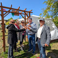 Die Eröffnung der Veranstaltung war in diesem Jahr eine etwas Andere. Durften wir doch den Vorsitzenden des Stadtverbandes der Leipziger Kleingärtner, Robby Müller als Gast begrüßen. Und das hatte auch seinen Grund. Nach monatelanger Buddel-, Mäh-, Stemm-, Pflanz- und Mulchverteilarbeit wurden pünktlich um 14:00Uhr zwei Scheren an ihre Funktionäre übergeben. Die Eine in der Hand von Wolfgang Weigelt, dem aktuellen zweiten Vorsitzenden im Verein, die Andere in der Hand von Robby Müller. Gemeinsam stand man um 14:00Uhr vor dem Band, was der Eröffnung unseres Naschgartens vorangehangen war. Schnipp Schnapp und Herzlich Willkommen lieber Robby in unserem Naschgarten. Warum der Herr Müller sich das Ganze mit anschauen und vor Allem der Eröffnung persönlich beiwohnen wollte? Ganz einfach: Nur durch die Hife des Stadtverbandes war es dem Orgateam rund um Anja Schlegel und Uta Weigelt möglich, eine brache und traurige Fläche im Verein umzuwandeln in einen Begegnungsgarten, der seine Besucher einlädt, Feige, Nektarine, Birne, Heidelbeere & Co zu naschen und einfach mal ein paar Minuten zu verweilen. Verweilen unter einem (hoffentlich bald) von Wein bewachsenem Pavillon, verweilen um Inspirationen für den eigenen Garten zu sammeln oder verweilen, um einfach mal den Stress des Alltags abzulegen und durchzuatmen. Der Mittelpunkt des Naschgartens bildet ein sehr besonderer Baum. Ein Ginko. Ein Ginko, der uns ewig an unseren im letzten Jahr verstorbenen Vorsitzenden Frank Mielack erinnern wird. Frank hat seinen Platz im Trommelholz – für ewig. Und so soll es auch sein. Ein Herz aus Holz mit einem emotionalen Spruch schmückt den Weg zum Baum. Rundherum eine Bank – ebenfalls gefördert durch den Stadtverband der Leipziger Kleingärtner. Lieber Frank, vielleicht sitzt du ab und an hier und schaust uns zu – hier im Trommelholz. Ein großes Dankeschön an dieser Stelle an die Helfer rund um Anja Schlegel und Uta Weigelt, die dazu beigetragen haben – ach was sag ich – ohne die es nicht möglich gewesen wäre, aus einem Schutthaufen einen Steingarten, einem toten Boden einen Obstgarten, einer kaum zu bändigenden Wiese eine Heidelbeerhecke entstehen zu lassen. Mit einem Glas Sekt wurde angestoßen, angestoßen auf das fast fertige Projekt Naschgarten – fast, weil es noch viel zu tun gibt. Ein Weg möchte noch angelegt werden, Schilder sind geplant, die die Besucher über die einzelnen Bäume informiert. Danke Robby, dass du da warst. Wir haben uns sehr gefreut!